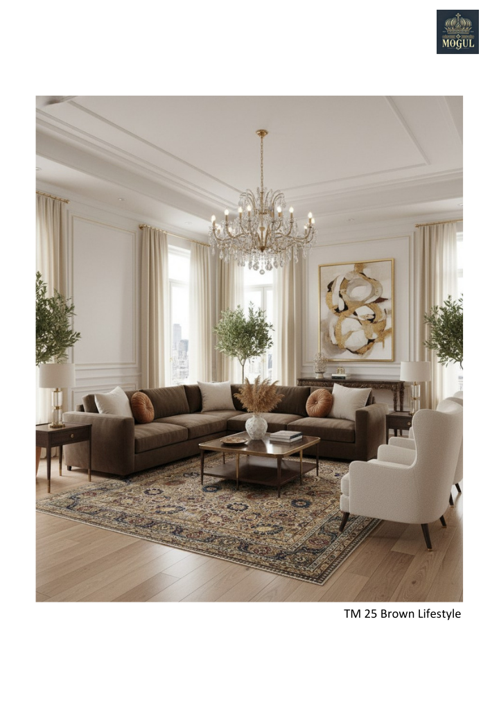 The unique and intricate design showcases classic Kashmiri floral and ornamental patterns, harmoniously arranged in a balanced layout. The rich brown color base, complemented by subtle accents, makes this rug versatile enough to elevate both traditional and modern interiors. Whether placed in a living room, formal sitting area, bedroom, or luxury office, it instantly adds depth, warmth, and sophistication.